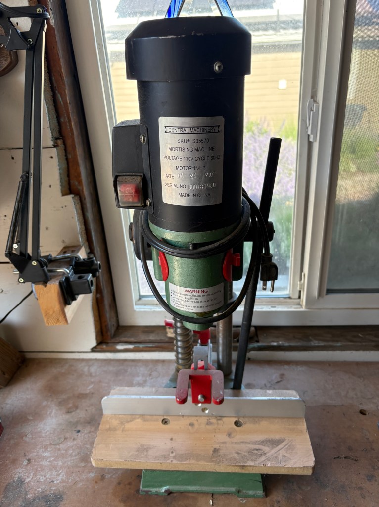This week’s mystery tool: a Central Machinery Mortising Machine—SKU S35570—with a nearly new set of mortising bits.